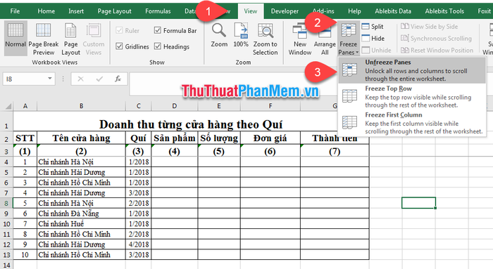 Để hủy giữ chặt dòng, vào thẻ Xem (1), chọn Đóng băng cửa sổ (2) => chọn Hủy giữ chặt cửa sổ (3).