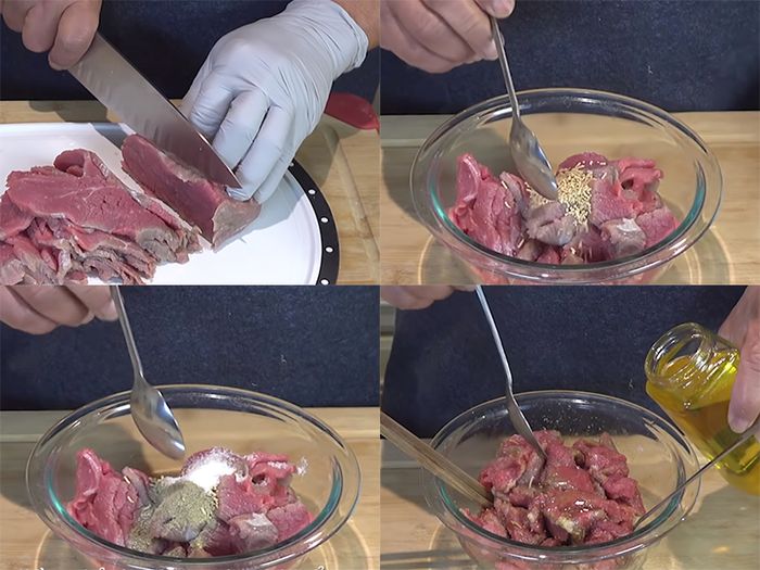 Thả thịt bò đã thái vào một tô lớn, thêm 1/2 muỗng cà phê muối, 1 muỗng cà phê hạt nêm, 1/2 muỗng cà phê bột ngọt, 1 chút tiêu xay, 1/2 muỗng cà phê nước tương và 1/2 muỗng cà phê dầu hào. Kết hợp đều và ướp khoảng 15 – 20 phút để thịt thấm đều gia vị.