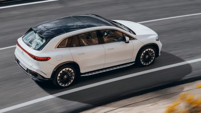 Cửa sổ trời toàn cảnh tiêu chuẩn có màu đen, Mercedes-Benz EQS SUV trông thấp hơn khi ngoại thất được sơn màu sáng. Đặc biệt, xe vẫn giữ được tính khí động học tốt ngay cả khi chỉ số tiết kiệm điện tổng thể không bằng EQS sedan. Cụ thể, mẫu SUV mới có bậc lên xuống 2 tông màu ở mỗi bên và bộ khuếch tán phía sau để cải thiện tính khí động học.