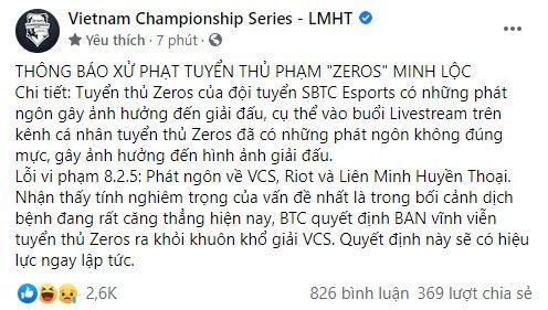 Vào sáng ngày 23/12 (giờ Việt Nam), cộng đồng Esports Việt Nam bị xáo trộn bởi án phạt global ban đối với Minas, một thành viên của đội tuyển SBTC Esports trong Liên Minh Huyền Thoại: Tốc Chiến.