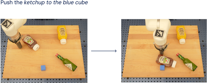Có nhiều vật phẩm trong cảnh, nhưng chỉ có một trong bộ dữ liệu đào tạo là khối. Tuy nhiên, RT-2 đã thành công khi đẩy sốt cà chua về đích cụ thể được chỉ định.