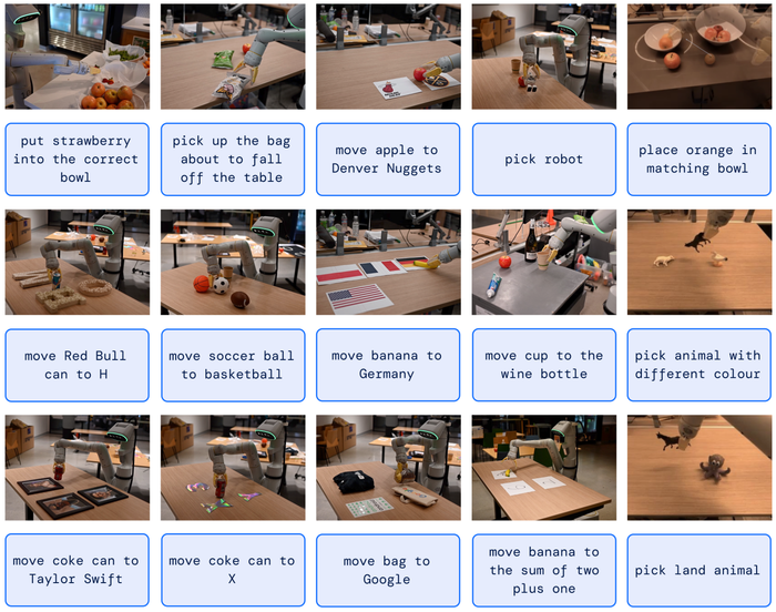 RT-2 was tested on various robotic skills that weren’t present in the robotics data. Credit: Google DeepMindCác thử nghiệm cho thấy RT-2 có khả năng tổng hợp ấn tượng. Nó cũng có khả năng hiểu về ngữ nghĩa và hình ảnh của dữ liệu robot một cách cải thiện mà trước đây chưa từng gặp.