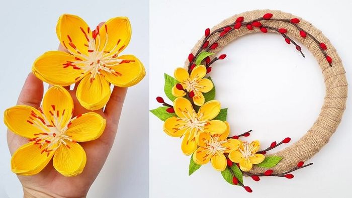 Mẫu vòng trang trí Tết hoa mai là mẫu làm vòng khó nhất, vì các nguyên liệu hoàn toàn được làm thủ công. Các bước thực hiện như sau: