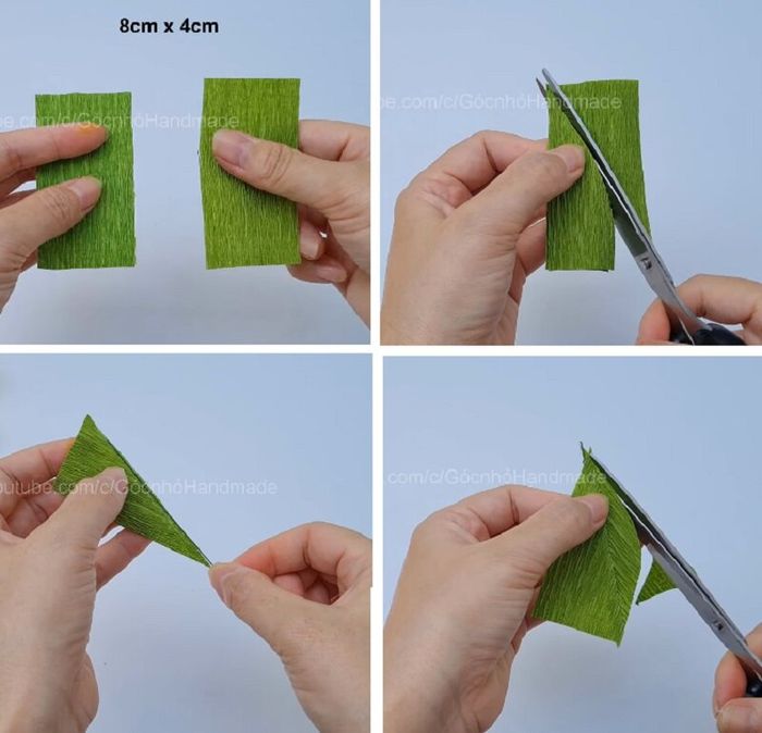 - Bước 4: Cắt giấy nhún xanh thành 8 hình chữ nhật 8x4cm. Dùng kéo cắt theo đường chéo để tạo 4 hình tam giác nhỏ. Dán kẽm quấn hoa vào cạnh dài nhất của tam giác, sau đó dán tiếp tam giác đối xứng qua trục kẽm. Dùng kéo tỉa lại thành hình chiếc lá