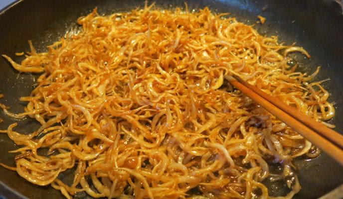 Hành khô: Lột vỏ, thái lát mỏng rồi chiên trong dầu nóng cho vàng thơm.