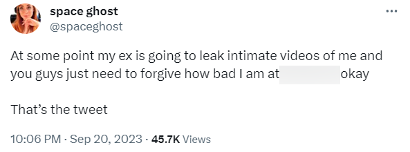 Tuy nhiên, gần đây, cô chia sẻ về nguy cơ bị phát tán video nhạy cảm do hành vi bạo hành của chồng cũ. Yaltz - chồng cũ của Space Ghost đã có hành động đánh đập và đe dọa phát tán video thân mật của cả hai.