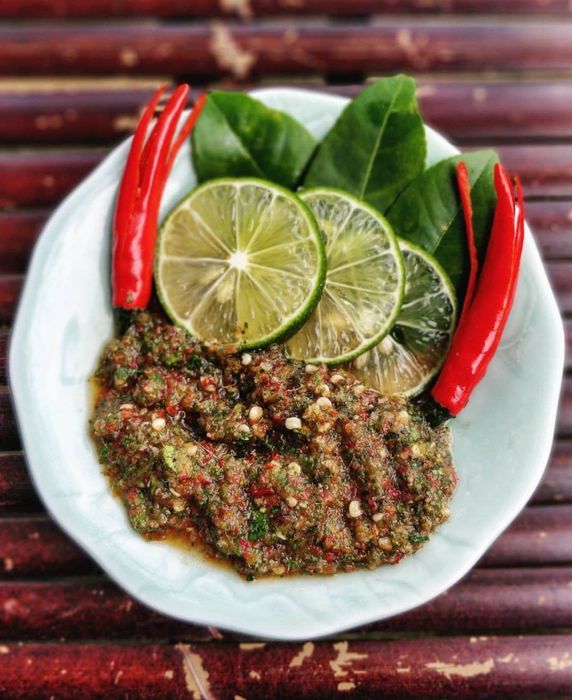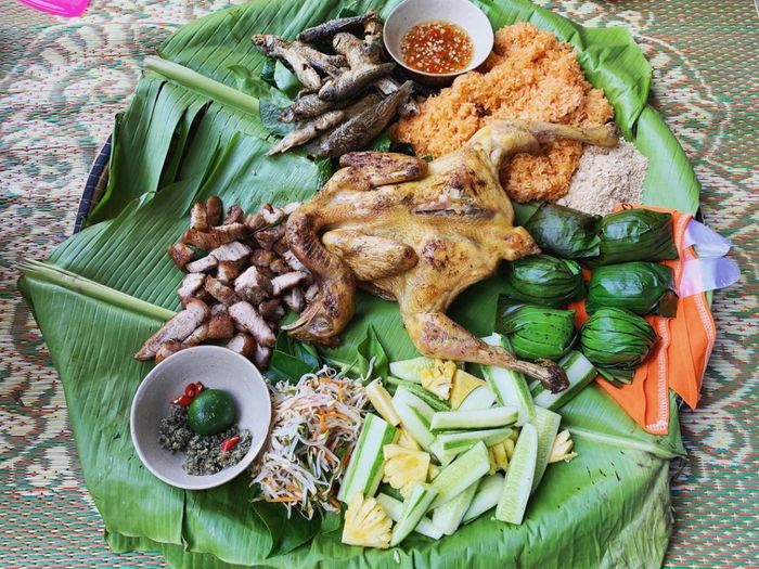 Khi thịt gà nướng đã có màu vàng óng, muối cheo đã được điều chỉnh đúng vị, là lúc để trang trí tất cả lên một chiếc đĩa tre, trải phủ lá chuối. Gà nướng chấm muối cheo trở nên hoàn hảo khi đi kèm với bát xôi dẻo thơm ngon. Khi thưởng thức ở những quán ăn địa phương, gà nướng thường được phục vụ cùng với cá sông, thịt heo nướng và đủ loại lá rừng.