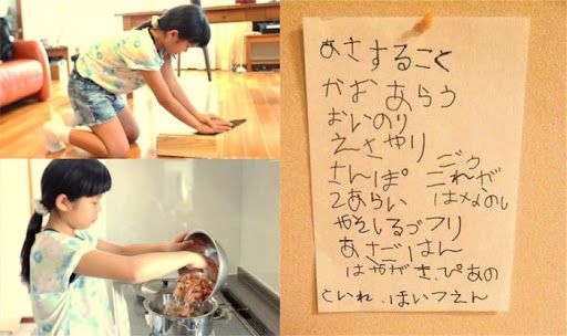 Trên tường vẫn treo tờ giấy ghi chú về những công việc hằng ngày của Hana mà mẹ để lại: Rửa mặt, cầu nguyện, cho chó ăn, đi bộ, nấu canh, ăn sáng, đánh răng, tập đàn, đi học…