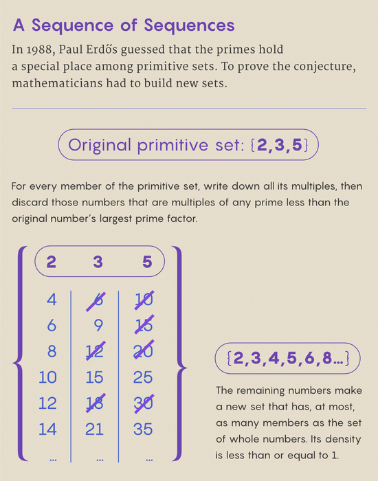 Erdős phát hiện ra rằng đối với bất kỳ tập hợp nguyên thủy nào, kể cả những tập hợp vô hạn, tổng đó—“tổng Erdős”—luôn là hữu hạn. Bất kể tập hợp nguyên thủy có vẻ như thế nào, tổng Erdős của nó luôn nhỏ hơn hoặc bằng một số nào đó. Và vì vậy trong khi tổng đó “trông, ít nhất là trên bề mặt, hoàn toàn xa lạ và mơ hồ,” Lichtman nói, nó ở một số cách nào đó “kiểm soát một số sự hỗn loạn của tập hợp nguyên thủy,” làm cho nó là công cụ đo đạc phù hợp nhất để sử dụng.