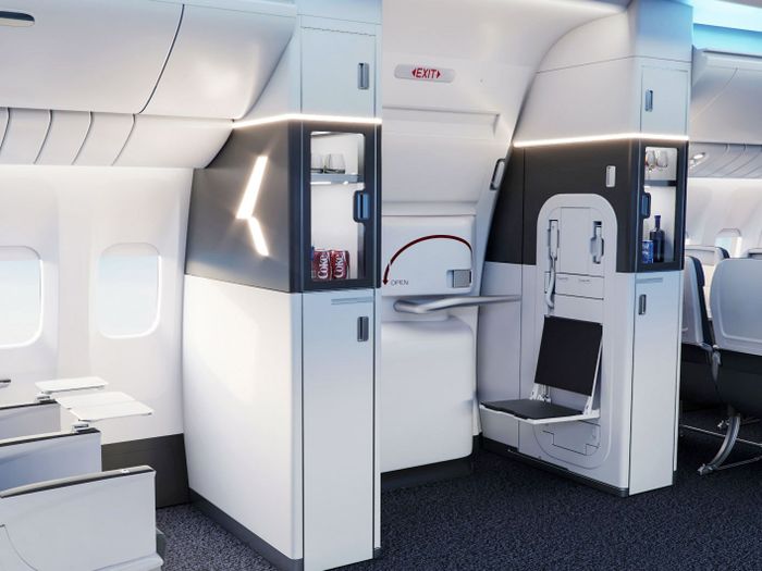 Nhà cung cấp ngành công nghiệp Collins Aerospace muốn tái chiếm lại tám feet hoặc hơn của không gian trước cửa thoát hiểm trên máy bay có thân rộng, hai lối đi. Hiện tại đó thường là nơi của ghế nhảy mà một thành viên phi hành đoàn ngồi khi cất cánh và hạ cánh, và một điểm tập trung cho những người đang đợi sử dụng phòng vệ sinh. Để chiếm lại lãnh thổ, Collins đã tạo ra M-Flex Duet. Hệ thống kệ đa năng, biến hình này có thể gập hoàn toàn vào hai tảng nhựa mảnh mỏng ở hai bên cửa, để di chuyển, cất cánh và hạ cánh. Trong suốt chuyến bay, nó có thể mở ra qua cửa, tạo ra một quầy phục vụ tự phục vụ. Đó là một tiện ích bổ sung cho hành khách, một nguồn thu nhập tiềm năng cho các hãng hàng không, và ít công việc hơn cho tiếp viên đi lại giữa các hàng ghế.