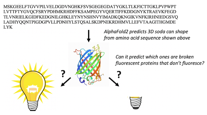Chỉ có một nhà hóa học với lượng kiến thức đáng kể về protein phát quang mới có thể sử dụng trình tự axit amin để tìm các protein phát quang có trình tự axit amin đúng để trải qua các phản ứng hóa học cần thiết để làm cho chúng phát quang. Khi chúng tôi trình bày trình tự của 44 protein phát quang không có trong cơ sở dữ liệu protein cho AlphaFold2, nó gập các protein phát quang cố định khác nhau so với những protein bị hỏng.