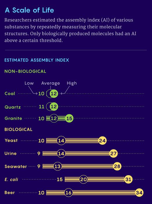 Điều đó có thể sắp thay đổi. Trong năm 2021, một nhóm do Lee Cronin của Đại học Glasgow ở Scotland và Sara Walker của Đại học Arizona dẫn đầu đã đề xuất một cách rất tổng quát để xác định các phân tử được tạo ra bởi các hệ thống sống—thậm chí cả những hệ thống sử dụng hóa chất không quen thuộc. Phương pháp của họ, họ nói, đơn giản là giả định rằng các hình thức sống ngoài hành tinh sẽ tạo ra các phân tử có độ phức tạp hóa học tương tự như sự sống trên Trái Đất.