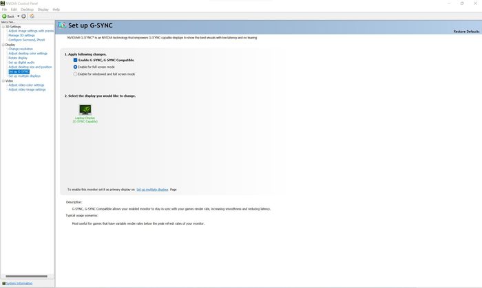 Như đã đề cập ở trên, MUX switch không chỉ liên quan đến hiệu suất mà còn mở ra các tính năng của dGPU như G-SYNC. Khi chuyển sang chế độ dGPU only, NVIDIA Control Panel cung cấp nhiều tùy chọn tương tự như trên desktop, bao gồm cả G-SYNC. Khi chuyển về chế độ tự động (Optimus), các tùy chọn này sẽ bị ẩn đi.