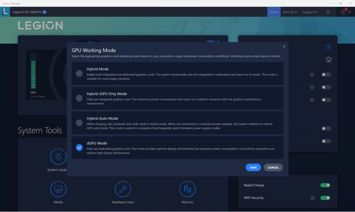 Các laptop chơi game thường đi kèm phần mềm điều khiển từ các hãng sản xuất như MSI với Dragon Center, ASUS với Armoury Crate, HP với Omen Gaming Hub hoặc Lenovo với Lenovo Vantage. Bạn có thể tìm kiếm trong phần mềm theo thương hiệu laptop, mục chuyển đổi GPU, chế độ làm việc của GPU hoặc các tùy chọn tương tự. Nếu có lựa chọn như Đồ họa rời, Chế độ dGPU và yêu cầu khởi động lại khi kích hoạt, thì laptop của bạn có công tắc MUX. Ngoài ra, bạn cũng có thể kiểm tra trong BIOS/UEFI.