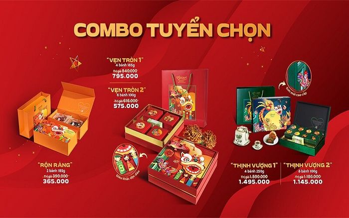 - “Thịnh Vượng” 2 giá 1.145.000 đồng với 8 bánh Trung thu 100g, bao gồm 8 hương vị khác nhau như: Đậu xanh lá dứa, trà xanh đậu đỏ hạt sen, thập cẩm Sài Gòn, thập cẩm gà quay vi cá, cà phê tan chảy, tinh than tre nhân trứng muối chảy, khoai môn hạt sen và đậu xanh gừng đường đen trái cây dẻo.