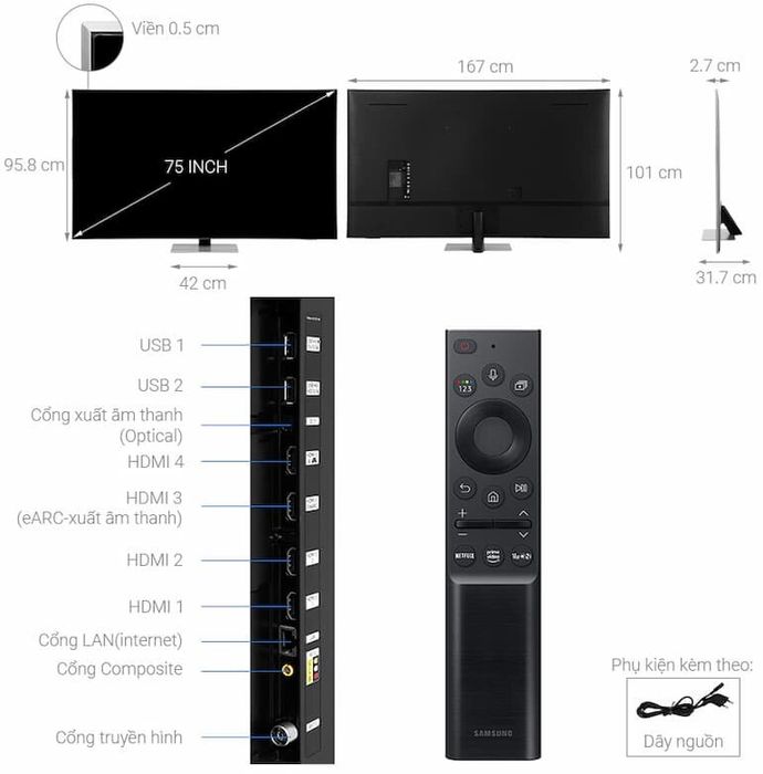 Kích thước của tivi Samsung 75 inch là gì? Tivi Samsung 75 inch là một lựa chọn sang trọng và cao cấp, phù hợp với không gian sống của bạn.