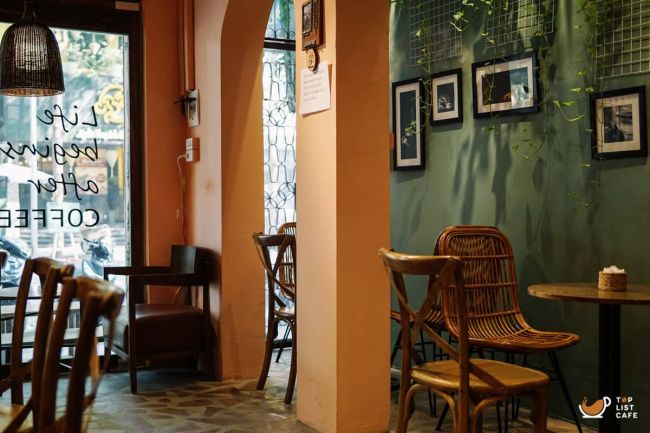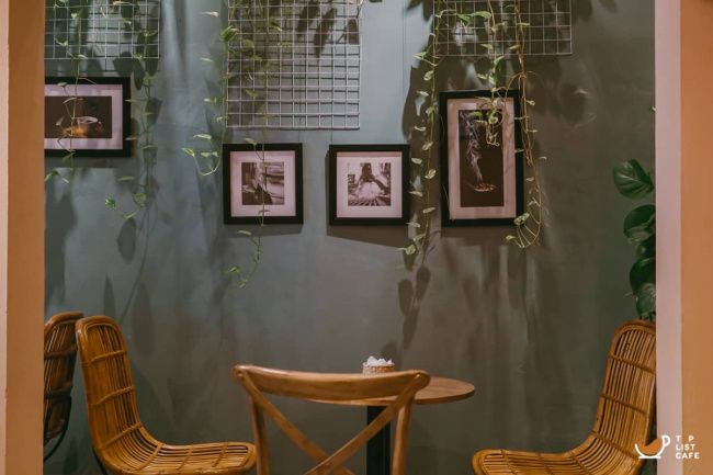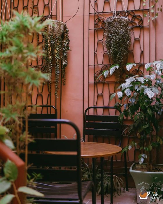 Bên ngoài kết hợp giữa phong cách cổ điển với tranh ảnh đơn sắc và sự trẻ trung của tông màu cam hồng, cùng với một góc tường xanh tươi lá rất bắt mắt. Một số bàn được sắp xếp gần nhau có thể làm bạn cảm thấy hơi chật chội khi quán đông.