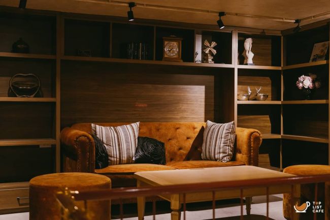 Khi bước vào bên trong, bạn sẽ trải nghiệm không khí pha chế giống như ở các quán pub với phong cách tối giản, tường ghi nhám giả bê tông và một số kệ/tủ đá để trưng bày phụ kiện nhỏ. Tuy nhiên, điểm nhấn lớn nhất là gác lửng phía trên, với bộ sofa êm ái và trang trí hợp thời trang, là lựa chọn hoàn hảo cho những người yêu thích không gian sống ảo.