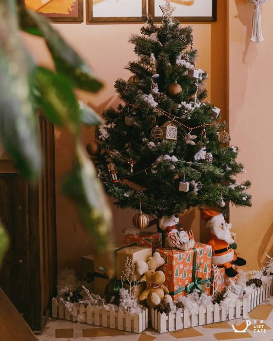 Quán trang trí nhiều cây xanh, bao gồm cả cây thông trang trí Noel được chu đáo tỉ mỉ.