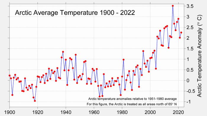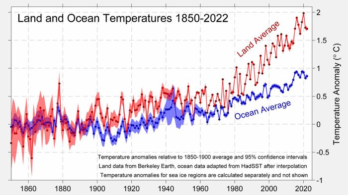 Biểu đồ trên cho thấy cách đất trái đất đã nóng lên gấp đôi so với đại dương, một xu hướng đã tiếp tục trong năm 2022. “Để bạn thay đổi nhiệt độ của đại dương, bạn cần nhiều năng lượng hơn so với đất”, Ahira Sánchez-Lugo, một nhà khoa học vật lý tại Trung tâm Thông tin Môi trường Quốc gia NOAA và là tác giả của báo cáo nhiệt độ của cơ quan này, nói. “Chỉ cần nghĩ về khi bạn đi đến bãi biển, ví dụ: Trong ban ngày cát cảm giác rất nóng, và nước lạnh.”