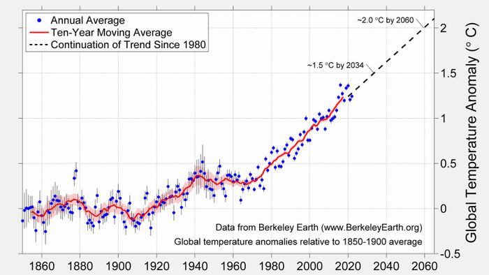Biểu đồ trên cho thấy một xu hướng đáng sợ: Năm 2022 có thể không phải là năm nóng nhất, nhưng Berkeley Earth dự đoán rằng đến năm 2034, chúng ta sẽ đạt được 1.5 độ C ấm lên, và 2 độ vào năm 2060. Mục tiêu lạc quan của Hiệp định Paris là duy trì sự ấm lên ở mức 1.5 độ so với nhiệt độ tiền công nghiệp, giới hạn là 2 độ. Nếu con người không thực hiện những thay đổi nhanh chóng để giảm phát thải, ước tính này đưa chúng ta vào đường dẫn đạt đến giới hạn 1.5 độ trong hơn một thập kỷ và ở nguy cơ cao hơn về nhiệt độ cực kỳ cao, ngập lụt và những tác động khác của biến đổi khí hậu.