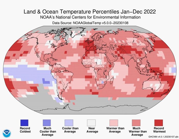 Sự tăng nhiệt tổng thể đã làm cho thời tiết trở nên kinh khủng hơn bao giờ hết ở một số khu vực trên thế giới trong năm 2022. Bản đồ trên từ NOAA, hoặc Cơ quan Quan trắc Khí tượng và Đại dương Quốc gia, là một biểu đồ trực quan tốt về nơi nhiệt độ đặc biệt cao và nơi ghi lại các kỷ lục.