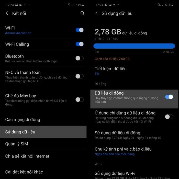 Truy cập Cài đặt > Chọn Kết nối > Tiếp theo, mở Sử dụng dữ liệu > Cuối cùng, tắt và mở lại Dữ liệu di động.