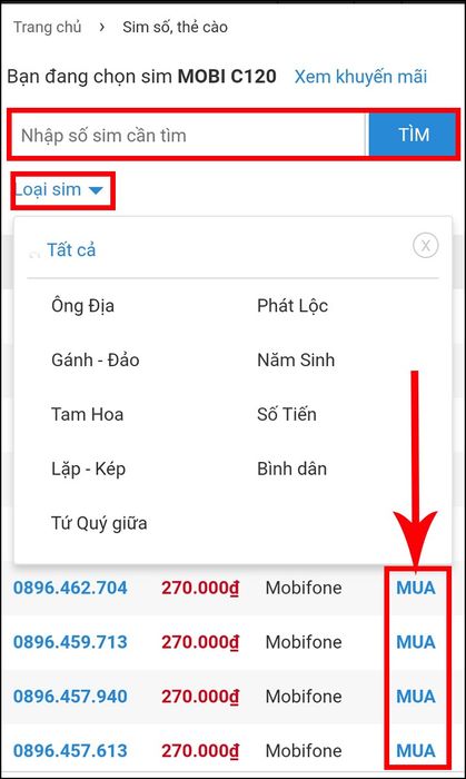 - Hoặc vào phần Loại sim, lựa chọn sim Thần Tài, Tứ Quý,... rồi chọn mua.