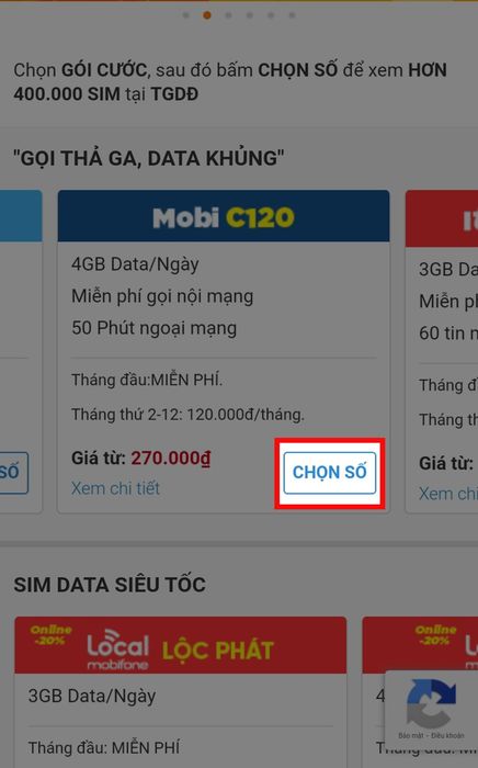 Bước 2: Vuốt xuống Gọi thả ga, data khủng, tìm đến mục Mobi C120, nhấn Chọn số.