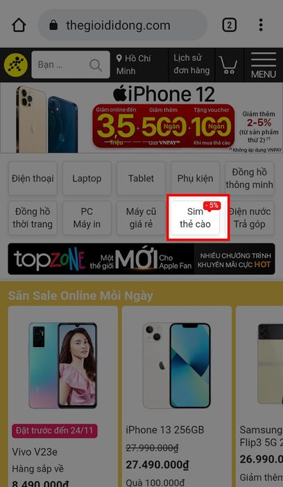 Bước 1: Truy cập trang web https://www.thegioididong.com/ và chọn mục Sim số, thẻ cào.