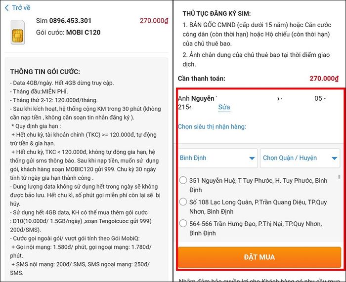 - Nhấn Mua tại số SIM bạn chọn.