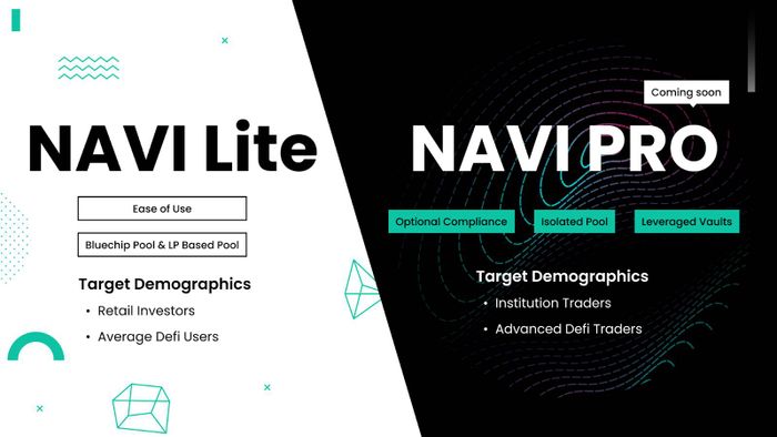 - NAVI Pro: Ngược lại với NAVI Lite, NAVI Pro là sản phẩm mà NAVI Protocol phát triển dành riêng cho các tổ chức, các nhà đầu tư DeFi chuyên nghiệp với các tính năng nâng cao như Optional Compliance, Isolated Pool, Leveraged Vaults.
