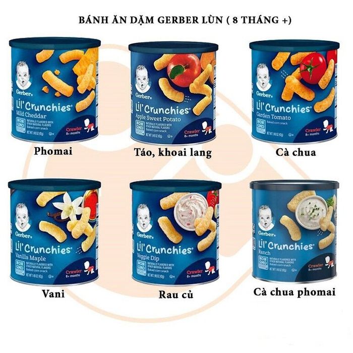 – Bánh ăn dặm Gerber hộp thấp với các hương vị như cà chua – tỏi, phô mai, táo – khoai lang. Giá từ 54.000 VNĐ đến 70.000 VNĐ.