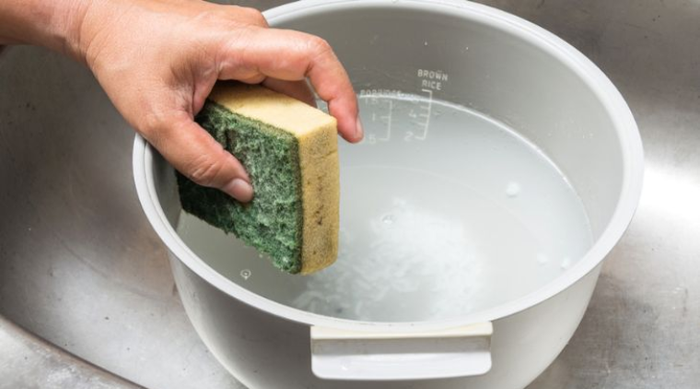 Vệ sinh nồi cơm đúng cách: Không sử dụng cọ nồi sắt để làm sạch lòng nồi. Thay vào đó, hãy dùng miếng bọt biển hoặc vải mềm để rửa sạch nồi.