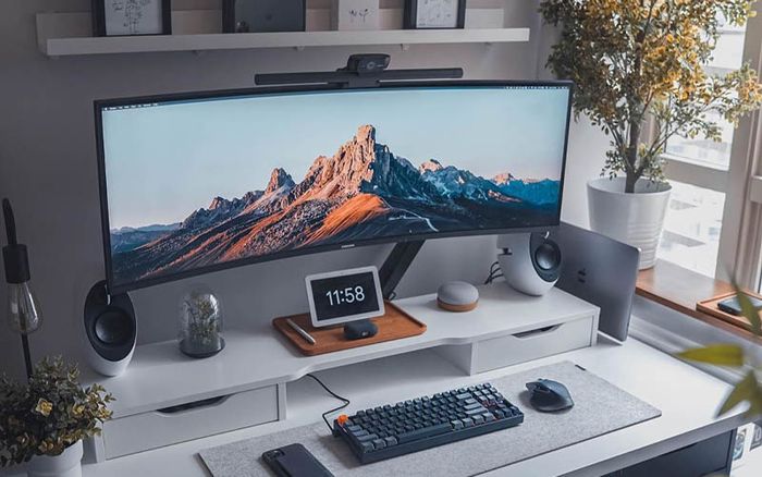 Đặt màn hình cong trên bàn là lựa chọn phổ biến, nhưng hãy cân nhắc kỹ nếu diện tích bàn của bạn có hạn để tránh sự chật chội khi sở hữu một chiếc PC màn hình cong.