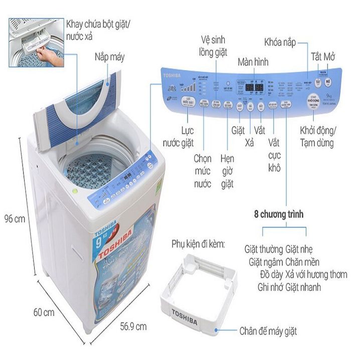 - Tông màu trắng của máy giặt Toshiba 9kg này trông sạch sẽ và hiện đại. Đây là lựa chọn lý tưởng cho gia đình có đến sáu người.