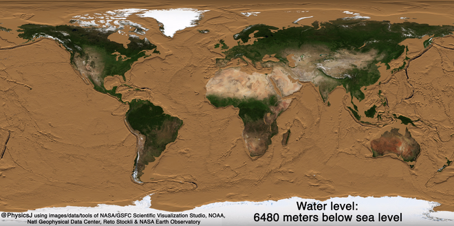 Nếu mực nước biển giảm thêm 6000m, hầu hết nước trên đại dương sẽ biến mất và Trái Đất sẽ trở nên khô cằn, với đáy biển hoàn toàn lộ ra. Tuy nhiên, Rãnh Mariana vẫn giữ được nước biển với độ sâu khoảng 11km. Để làm khô cạn hoàn toàn nơi sâu nhất trên Trái Đất, mực nước biển phải giảm thêm 5000m, theo video mô phỏng của NASA.