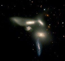 Sự tiến hóa của các thiên hà bị ảnh hưởng mạnh mẽ bởi quá trình tương tác và va chạm giữa chúng. Việc sáp nhập thiên hà diễn ra khá thường xuyên trong giai đoạn đầu của vũ trụ, dẫn đến nhiều thiên hà có hình thái không bình thường. Mặc dù khoảng cách giữa các ngôi sao là rất lớn, nên các hệ sao trong các thiên hà va chạm không bị ảnh hưởng nhiều, nhưng lực hấp dẫn có thể làm mất khí và bụi liên sao trong các cánh tay xoắn ốc, tạo ra các đuôi thủy triều dài. Thiên hà NGC 4676 và thiên hà Antennae là những ví dụ điển hình của hiện tượng này.