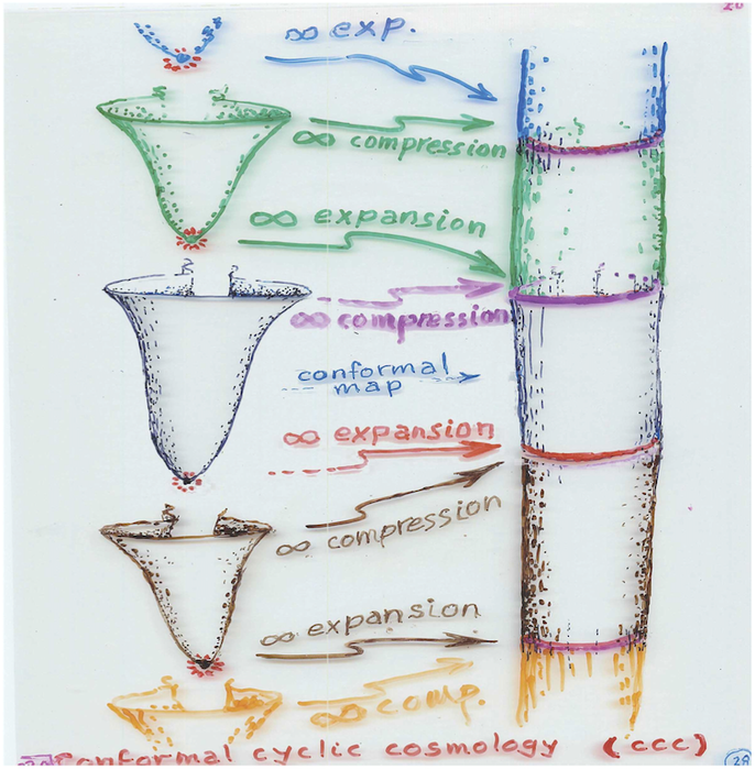 Penrose cho thấy cách trạng thái lạnh dày đặc và trạng thái nóng dày đặc có thể liên quan đến nhau thông qua co giãn tuân thủ sao cho chúng phù hợp về hình dạng của không gian thời gian - mặc dù không phải về kích thước của chúng. Thật thú vị khi nhìn nhận làm thế nào hai đối tượng có thể giống nhau như vậy khi chúng có kích thước khác nhau - nhưng Penrose luận điệu rằng khái niệm về kích thước ngừng có ý nghĩa trong những môi trường vật lý cực kỳ cực kỳ.