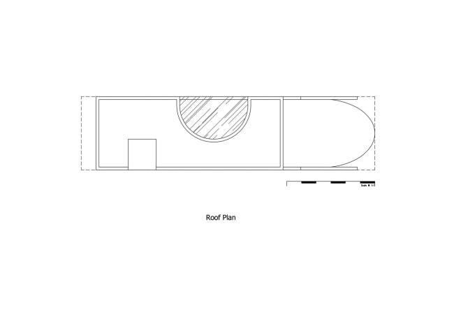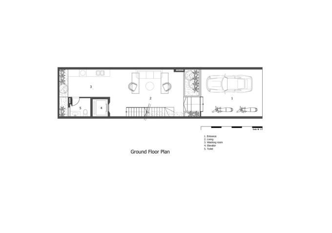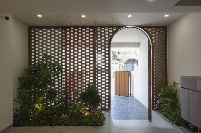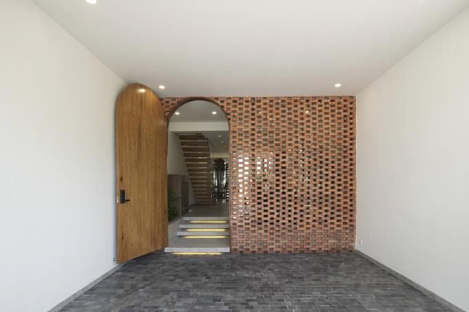 Để khắc phục nhược điểm của nhà ống và thích ứng với khí hậu nhiệt đới nóng ẩm tại Đà Nẵng, nhóm kiến trúc sư chia ngôi nhà thành ba phần: trước, sau và một khoảng không gian lớn ở giữa. Ở tầng trệt, có khu vực để xe ngăn cách với không gian sống bằng tường gạch do chứa nhiều chất độc hại. Phía sau là không gian tiếp khách và khu giặt phơi, cùng một giếng trời nhỏ để đối lưu không khí và phơi quần áo.