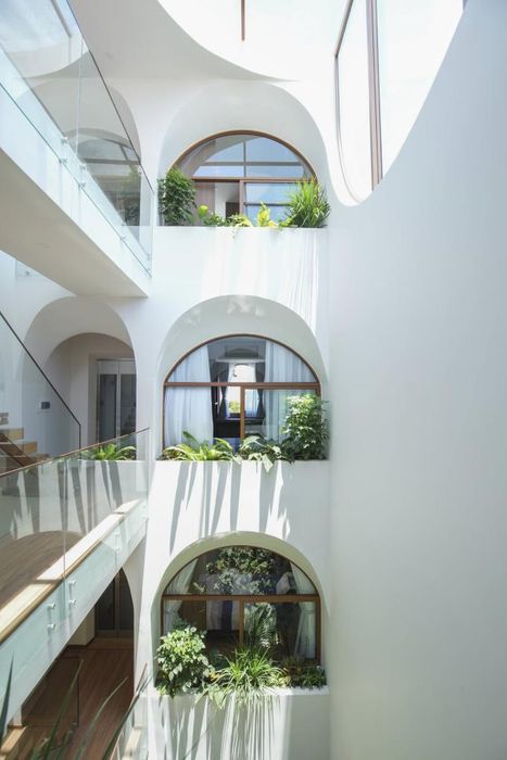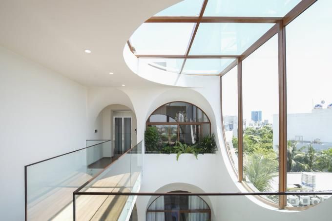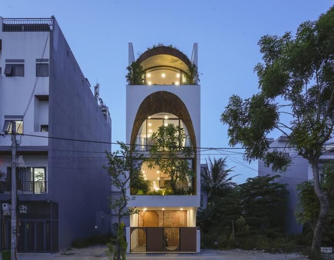 Mặt tiền Vux House gây ấn tượng với những đường cong mềm mại.