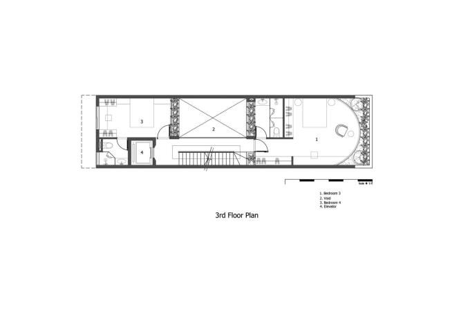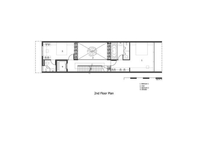 Tầng 2 và 3 được bố trí phòng ngủ lớn ở phía trước và phòng ngủ nhỏ phía sau, tận dụng ánh sáng tự nhiên. Cả hai không gian này được kết nối bằng cầu hành lang. Giữa là giếng trời lớn, chạy từ tầng 4 xuống tầng trệt, bao quanh bởi cây xanh, tạo cảm giác gần gũi với thiên nhiên.