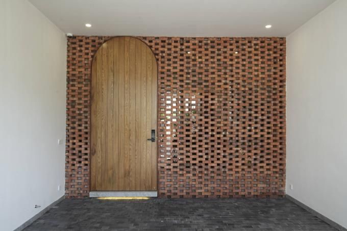 Cổng chính được làm từ vật liệu địa phương như gạch nung và đá tổ ong.