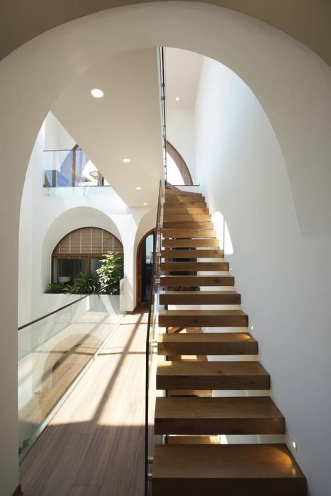 Cầu thang gỗ kiểu bay liên kết các tầng trong nhà.