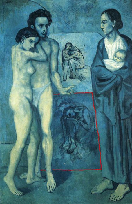 Một phiên bản chưa hoàn thiện của bức chân dung xuất hiện trong nền của La Vie của Picasso, nhưng bản gốc không được phát hiện cho đến khi tia X đã khám phá ra nó phía sau Bữa ăn của Người Mù.
