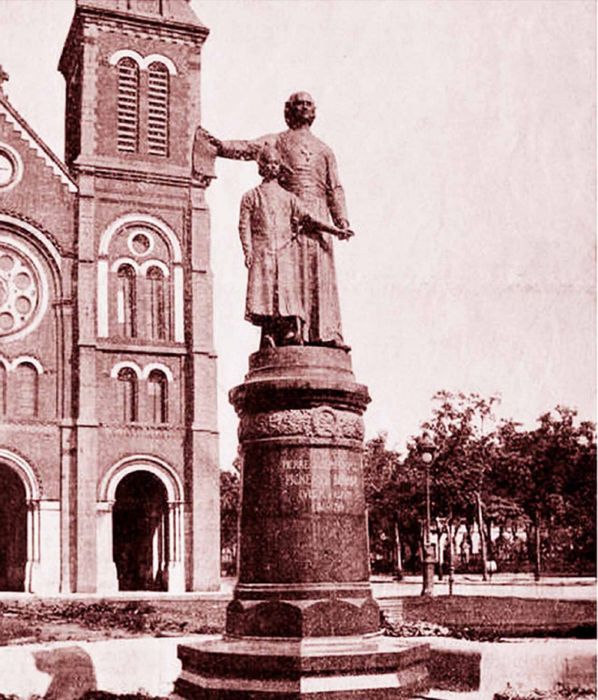 Bức tượng Pigneau de Béhaine dắt tay hoàng tử Nguyễn Phúc Cảnh, biểu tượng hòa hợp giữa đạo Công giáo và Triều Nguyễn, được đúc bằng đồng vào năm 1903. Sau năm 1945, bị phá bỏ, giờ chỉ còn bệ đá hoa cương.