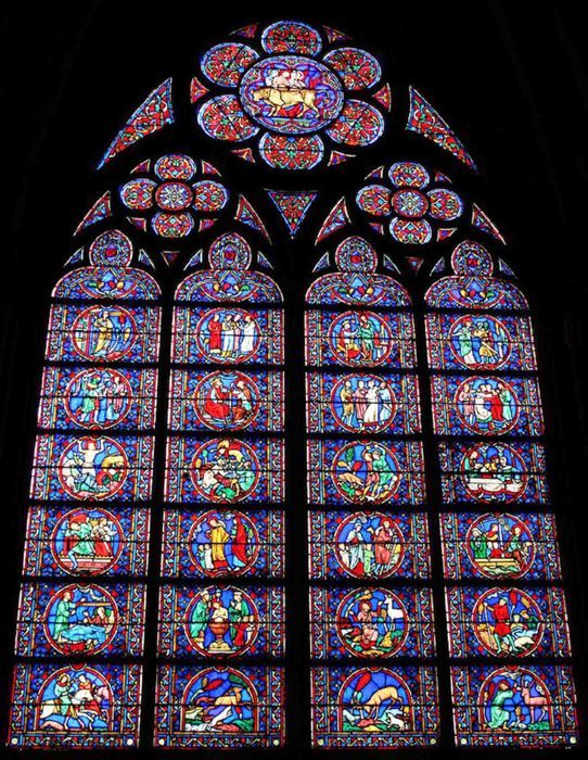 Trong nhà thờ Đức Bà, 56 cửa kính trên tường miêu tả các nhân vật và sự kiện trên Thánh Kinh. Cùng với 35 bông hồng tròn và 25 cửa sổ mắt bò được ghép bằng kính nhiều màu thành những hoa văn ấn tượng. Những hoa văn này thực sự quyến rũ và khiến ai cũng muốn ngắm nhìn.