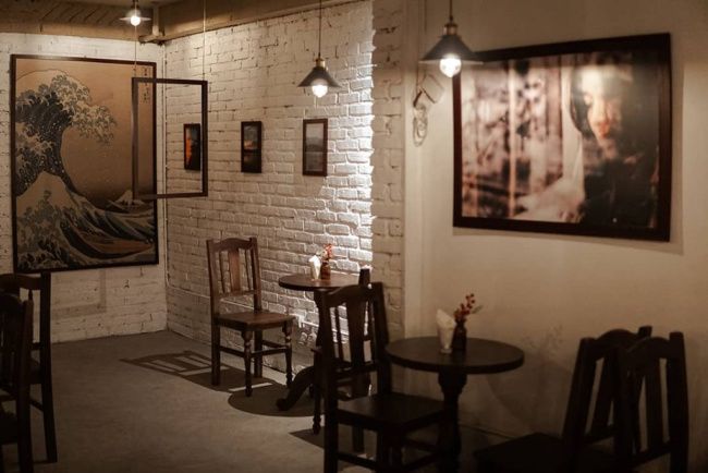Nhà Trong Ngõ chú trọng vào tranh phong cách trừu tượng và vintage treo trên tường, tạo vibe độc đáo cho quán.