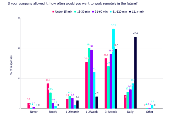 Với xu hướng này, dễ hiểu rằng nhân viên cần phải di chuyển nhiều nhất thích làm việc từ nhà nhiều hơn, với gần một nửa trong số họ muốn làm điều đó hàng ngày.