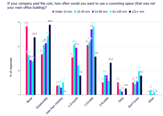 Tuy nhiên, nếu có một không gian làm việc gần nơi cư trú của nhân viên, một số lớn người sống giữa 15 và 120 phút từ văn phòng muốn sử dụng một không gian làm việc chung ít nhất mỗi tuần — thậm chí những người sống 2 giờ trở lên từ văn phòng cũng muốn sử dụng "đôi khi".